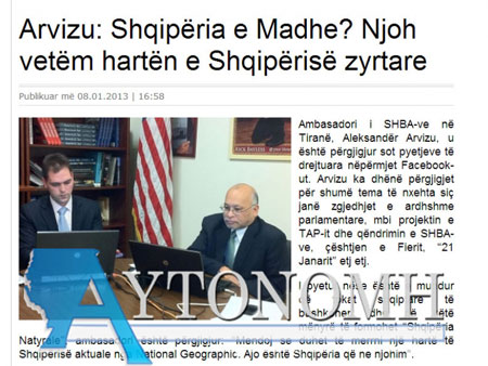 Κληθείς να απαντήσει για το κατά πόσο είναι εφικτή η επανένωση των «εθνικών εδαφών» της Αλβανίας ούτως ώστε να σχηματιστεί η «Φυσική Αλβανία», ο αμερικανός πρεσβευτής έδωσε ξεκάθαρη απάντηση: «Νομίζω πως πρέπει να πάρετε έναν πρόσφατο χάρτη της Αλβανίας από το National Geographic. Αυτή είναι η Αλβανία που εμείς αναγνωρίζουμε», δήλωσε χαρακτηριστικά ο Αρβιζού προκαλώντας απογοήτευση στους Αλβανούς!