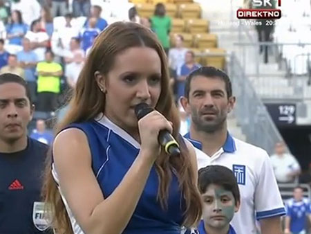 Ντυμένη στα γαλανόλευκα και με το μικρόφωνο ανά χείρας η Καλομοίρα τραγούδησε τον εθνικό μας ύμνο στο φιλικό αγώνα της Εθνικής Ελλάδος με την Νιγηρία, ο οποίος διεξήχθη στη Φιλαδέλφεια των ΗΠΑ!